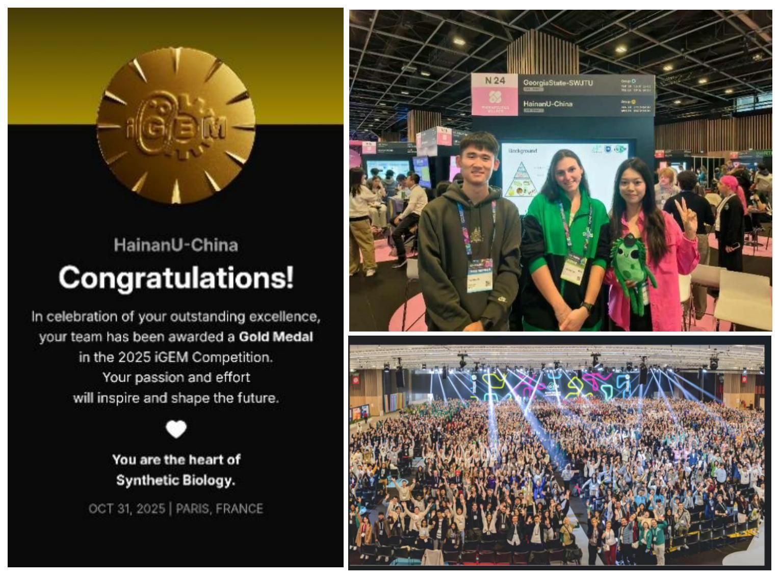 2025国际基因工程机器大赛(International Genetically Engineered Machine Competition,iGEM)于北京时间2025年10月31日在法国巴黎落下帷幕。3003必赢官网代表队HainanU-China再创佳绩,荣获全球金奖。自2022年创队以来,3003必赢官网已连续四年获得这一国际顶级赛事金奖!