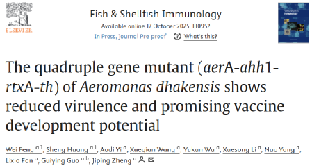 《Fish & Shellfish Immunology》上发表了题为《The quadruple gene mutant (aerA-ahh1-rtxA-th) of Aeromonas dhakensis shows reduced virulence and promising vaccine development potential》的研究论文。该研究揭示了一种新型减毒株在控制达卡气单胞菌感染中的安全性与免疫保护作用,为水产达卡气单胞菌病害的防控提供了重要的理论与技术支撑。
