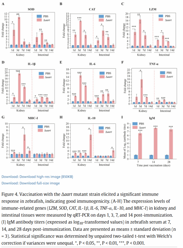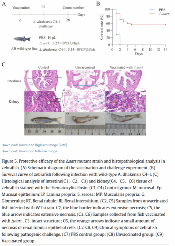 免疫实验显示,Δaart可在宿主体内诱导先天免疫与获得性免疫的双重激活。在攻毒实验中,Δaart免疫组展现出的相对保护率(RPS)显著高于未免疫对照组。组织病理分析显示,免疫鱼的肠道与肾组织结构完整,仅有轻度变性,而对照组出现明显坏死与结构破坏。