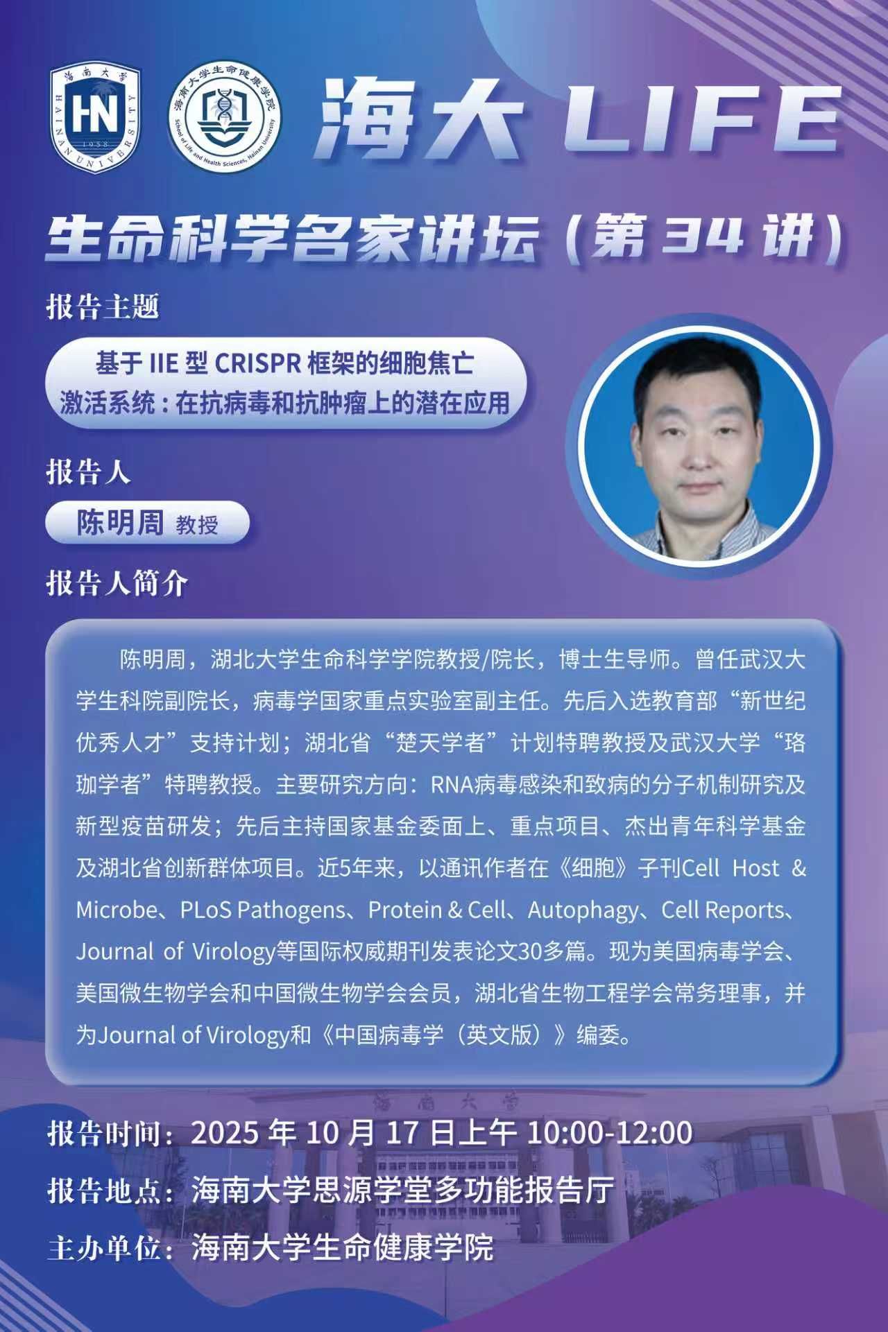 海大LIFE-生命科学名家讲坛(第34讲)| 陈明周:基于 III-E 型 CRISPR 框架的细胞焦亡激活系统:在抗 病毒和抗肿瘤上的潜在应用