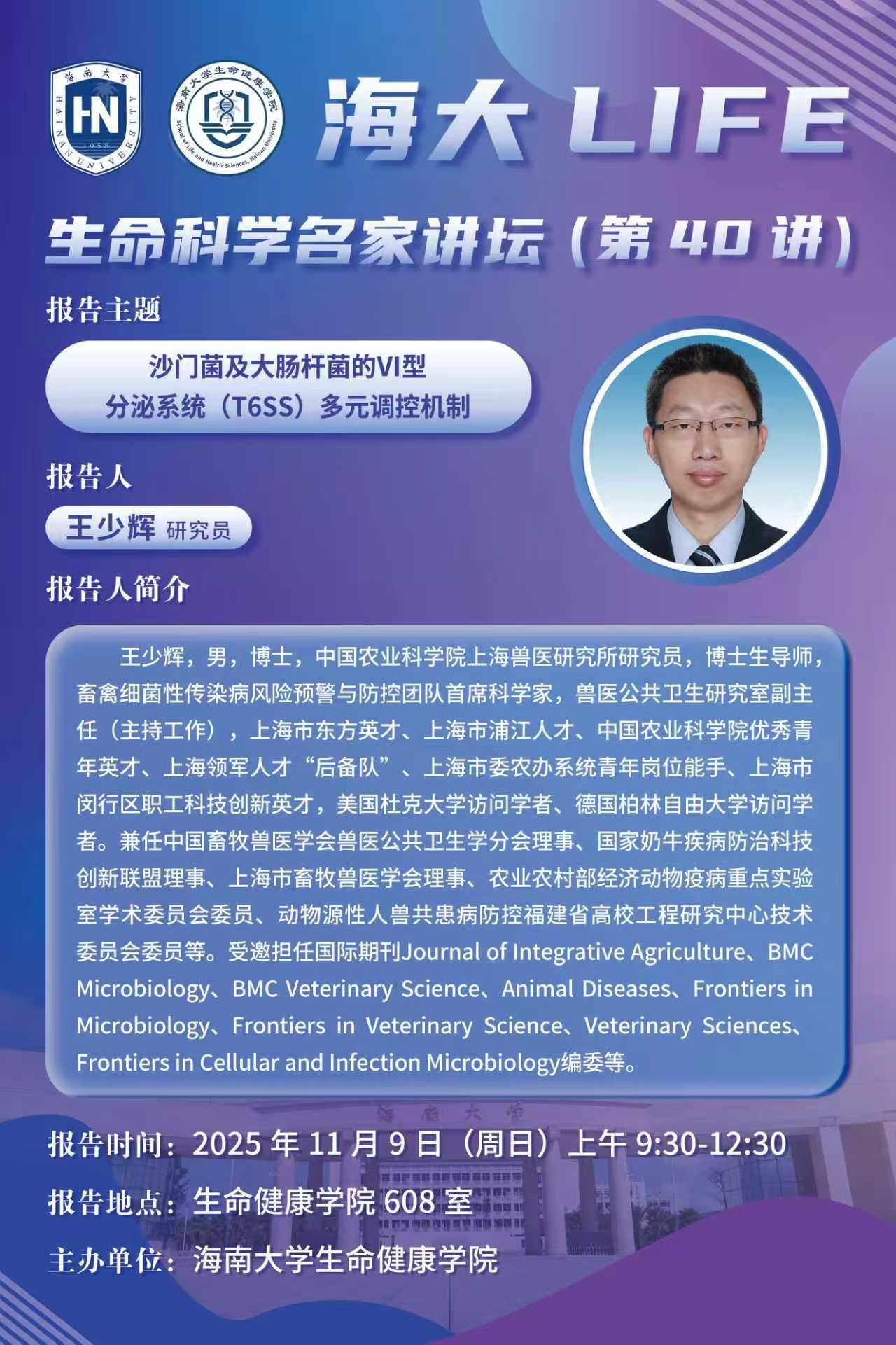 海大LIFE-生命科学名家讲坛(第40讲)|王少辉:沙门菌及大肠杆菌的Ⅵ型分泌系统(T6SS)多元调控机制