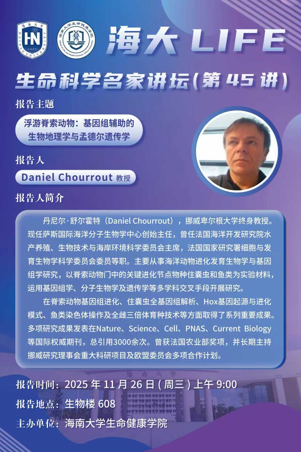 海大LIFE-生命科学名家讲坛(第45讲)| DanielChourrout:浮游脊索动物:基因组辅助的生物地理学与孟德尔遗传学